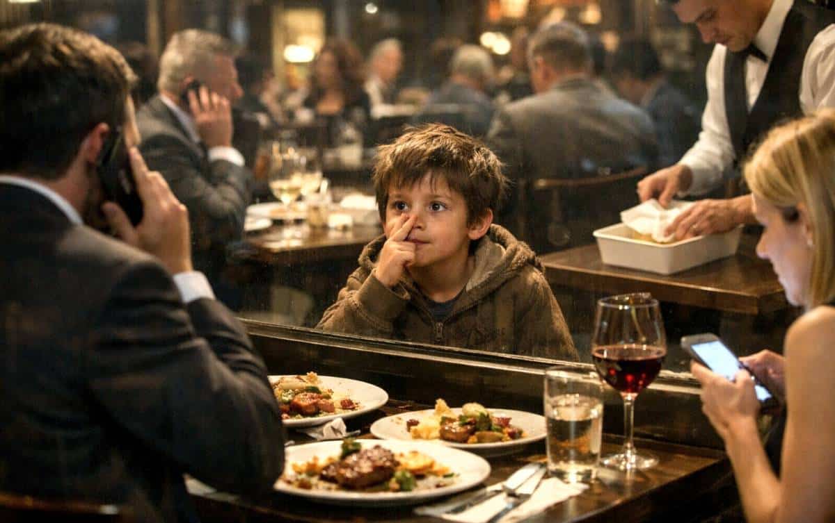 O garotinho olhava do lado de fora do restaurante os pratos fartos serem ignorados pelos frequentadores, que falavam ao celular e aparentemente não tinham fome de verdade.