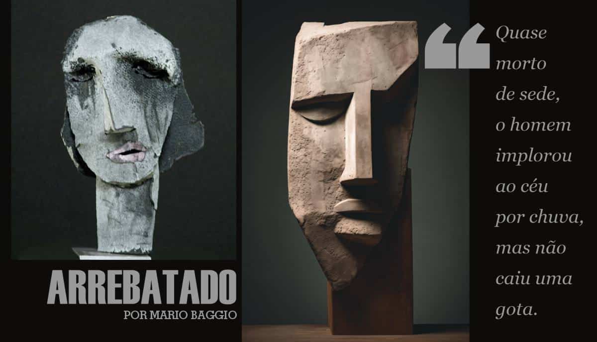 Quase morto de sede, o homem implorou ao céu por chuva, mas não caiu uma gota. Olhou pra cima e não viu uma só nuvem, só luz e azul. Rogou uma praga. Perambulou pela estrada poeirenta, o sol na cabeça. Viu algo no meio do caminho: uma escultura de madeira que alguém jogou fora. Era um rosto, uma cabeça. Uma cabeça completa. O homem a pegou nas mãos e a acariciou. Limpou a poeira e viu surgirem uns olhos, um nariz, uma boca. Um rosto. O rosto de um santo? Ele não sabia. Beijou aqueles lábios, quis saber que gosto havia ali. Colocou a escultura de pé, encostada numa pedra, e tomou distância para avaliá-la por inteiro. Aproximou-se novamente. “Escute aqui, meu chapa”, começou a conversar, como se estivesse na frente de uma pessoa de carne e osso (é assim que um solitário faz com aqueles que não o ouvem, para que o ouçam: “Escute aqui, meu chapa”).