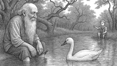 O velhinho enfiou os pés na água fria, distendeu os dedos doídos, espreguiçando-os, e saiu um pouquinho de dentro de si mesmo. Foi até ali em frente, no meio do lago, onde um pato nadava. Era um velhinho muito velho, com uma barba compridíssima – a pontinha bu