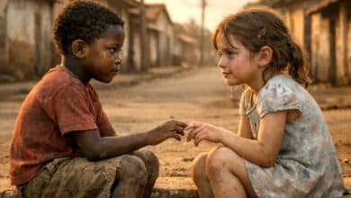 O menininho e a menininha estavam sentados na beirada da calçada. Ela olhou bem nos olhos dele, examinou-o desde o cabelo até os pés, disse: – Você é parecido comigo. – Você não é preta – ele disse. – Você é clarinho, é quase branco – ela disse. – A sua roupa