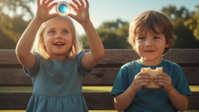 A menininha se aproximou com um objeto na mão. Mostrou para o menininho sentado no banco, num canto isolado. – Me dá um pedaço do seu lanche. Eu te mostro o meu olho – disse. O menininho ficou olhando com olhos tímidos. Depois passou o pão com mortadela para e