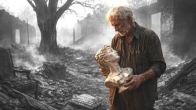 Ainda há fumaça saindo da cinza. Ainda há um inexplicável cheiro de rosas, entre as ruínas da casa, sob a cinza. Como se o cheiro das rosas saísse de debaixo das cinzas. Nenhuma parede em pé, móveis queimados, objetos vagos: ruínas. Ergo um busto de gesso, uma