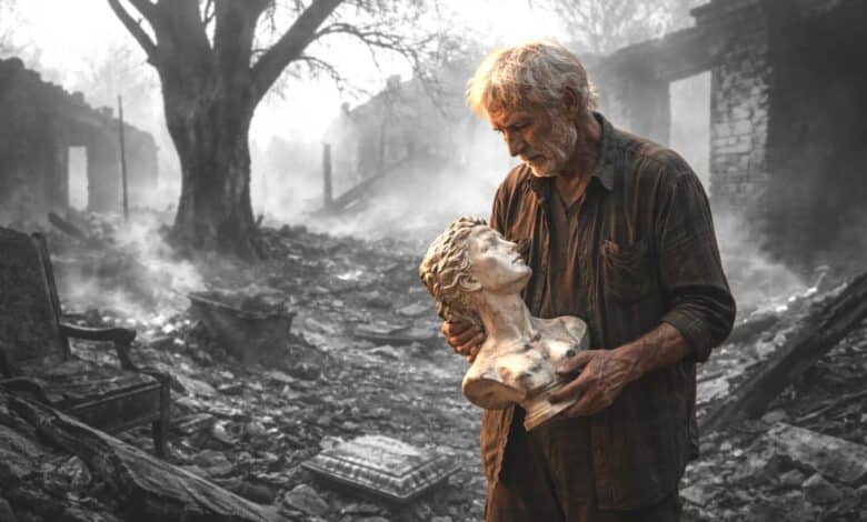 Ainda há fumaça saindo da cinza. Ainda há um inexplicável cheiro de rosas, entre as ruínas da casa, sob a cinza. Como se o cheiro das rosas saísse de debaixo das cinzas. Nenhuma parede em pé, móveis queimados, objetos vagos: ruínas. Ergo um busto de gesso, uma