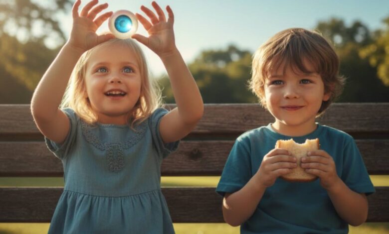 A menininha se aproximou com um objeto na mão. Mostrou para o menininho sentado no banco, num canto isolado. – Me dá um pedaço do seu lanche. Eu te mostro o meu olho – disse. O menininho ficou olhando com olhos tímidos. Depois passou o pão com mortadela para e