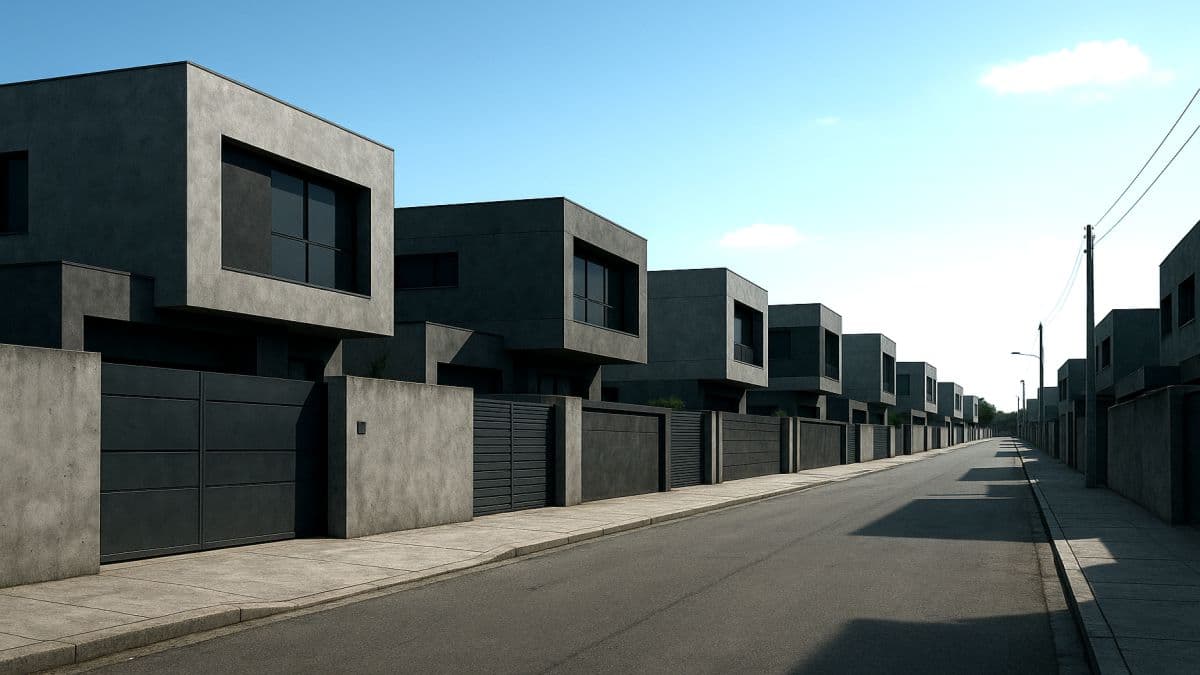 As casas, recentes, seguem o mesmo modelo arquitetônico: fachadas altas, linhas retas, vidro escuro, cimento aparente. A estética da segurança, do silêncio e da sobriedade. Tudo muito moderno. Tudo muito igual.