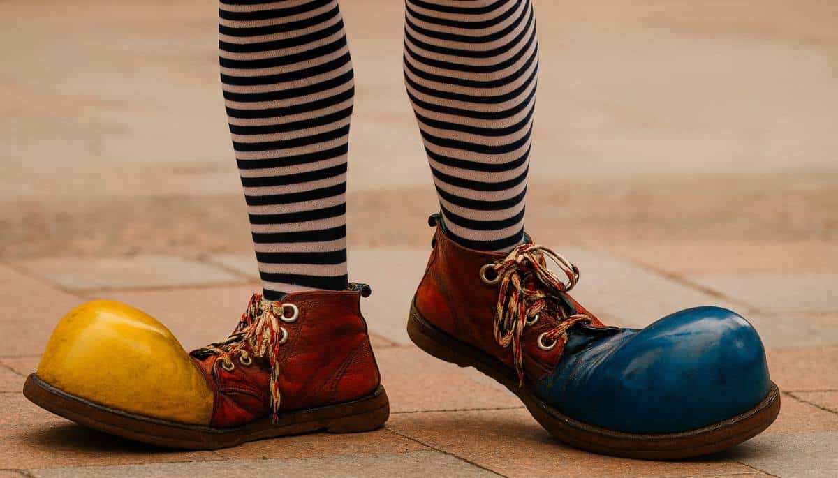 Deu tchau com os dedos e foi embora, perdido nos pensamentos e tropeçando nos enormes sapatos coloridos.