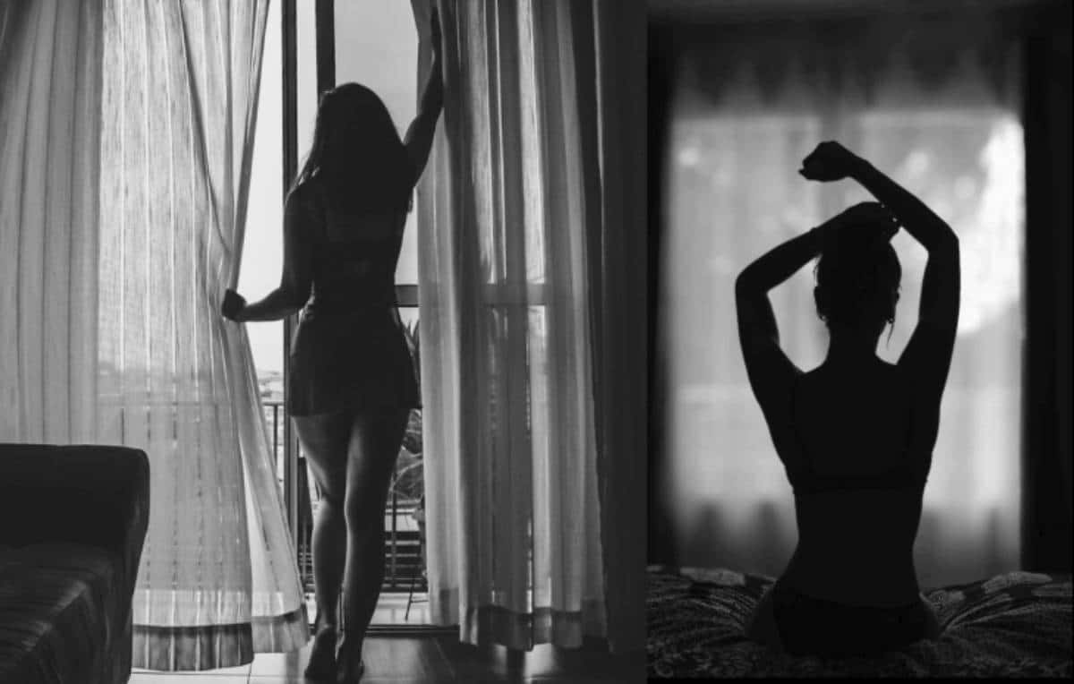 Completamente nua, o olhar sereno, fecha as cortinas e apaga a luz.