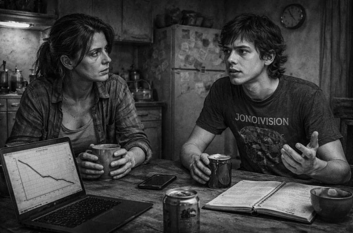 Filho: “Sou copywriter, economizei uma grana, ainda que pouca para os padrões burgueses. E minha tia, que pra mim é como irmã mais velha, já tem o apartamento dela, que será dividido comigo. Além disso, fui aprovado na Federal, e se houver algum futuro pra humanidade, eu terei algum tipo de futuro também.”